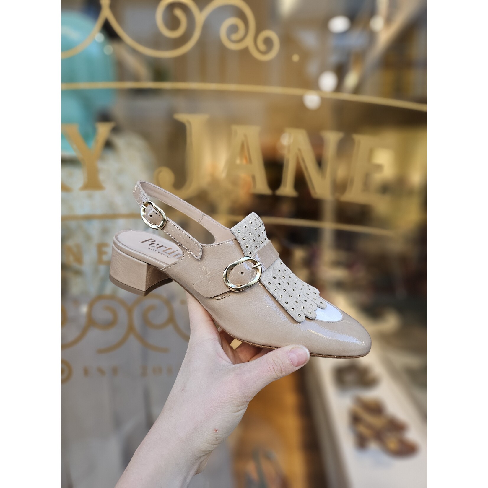 Deze prachtige schoenen van het Spaanse merk Pertini zijn gemaakt van hoogwaardig leer en combineren klassieke elegantie met moderne details. De beige kleur, samen met de witte neus en de stijlvolle gesp, geven de schoenen een verfijnde uitstraling. Met een kleine hak en een enkelbandje zijn ze niet alleen comfortabel, maar ook perfect voor zowel casual als formele gelegenheden.